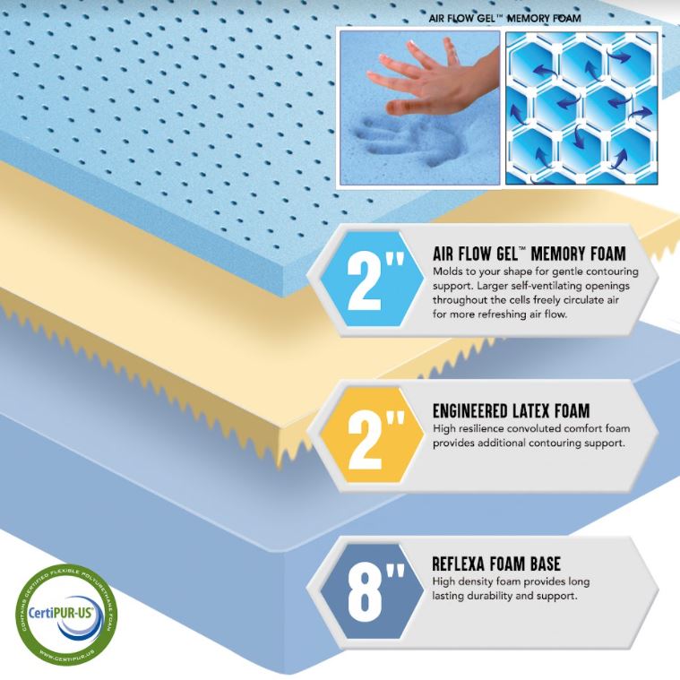 | The Ventura Cooling Gel Memory Foam Bed provides cooling comfort and medium firmness while you sleep at an amazing value. Airflow memory foam construction circulates air freely with ventilated gel foam made with cell expansion technology to keep you cool and dry while you sleep. Special manufacturing techniques prevent body impressions from developing. Ventura Cooling Gel Memory Foam provides firm contouring anatomical support with motion control for side back and stomach sleepers. All foam CertiPUR certified for safety. Encased with a removable hypoallergenic flame retardant soft poly stretch knit washable zipper cover.