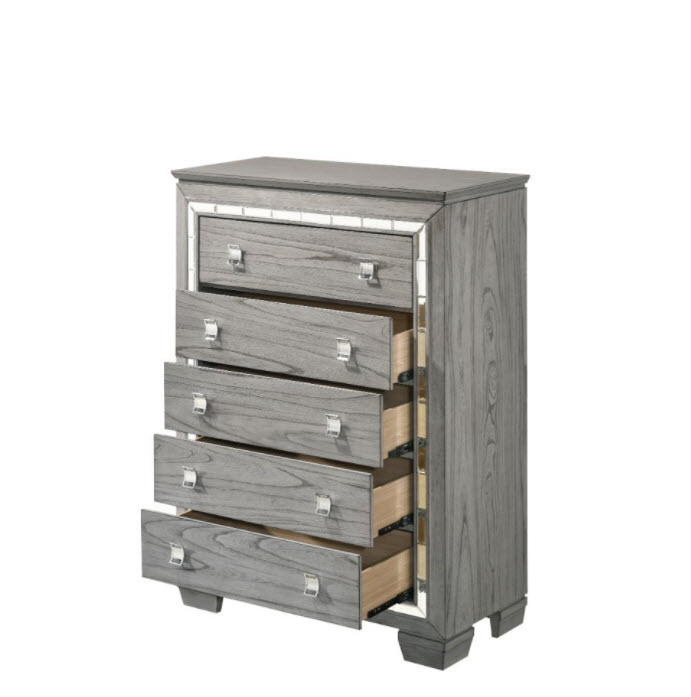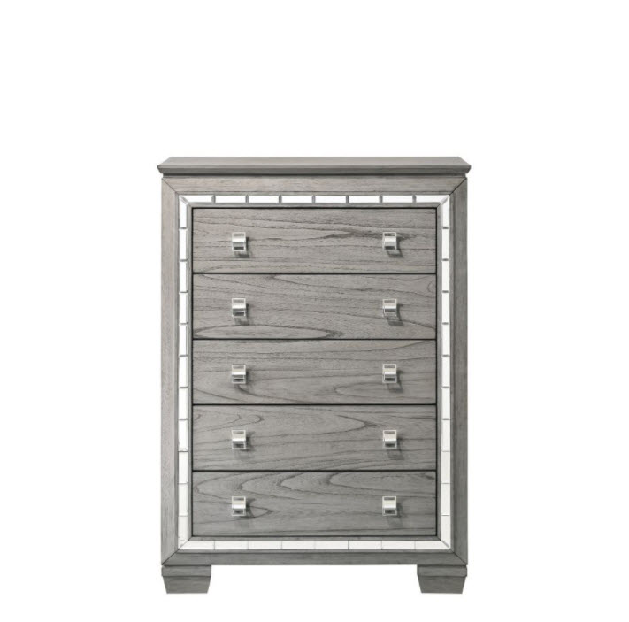 | a stylish storage solution with a touch of sophistication. This piece features a wooden frame and mirrored front trim, combining functionality with an elegant design. The wooden block leg shape, rectangular in form, adds a modern touch to the overall aesthetic.