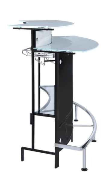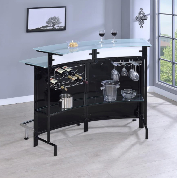 Bring a classy yet contemporary styling to your bar and entertaining area with this arched bar table. It is crafted with a black and chrome finish that offers neutral tones for your space. Arching slightly, it boasts plentiful storage space with a stemware rack, 8 bottle holder, and multiple shelves. Two frosted glass counter tops and a chrome foot rest makes this bar table cozy and stylish for your home.