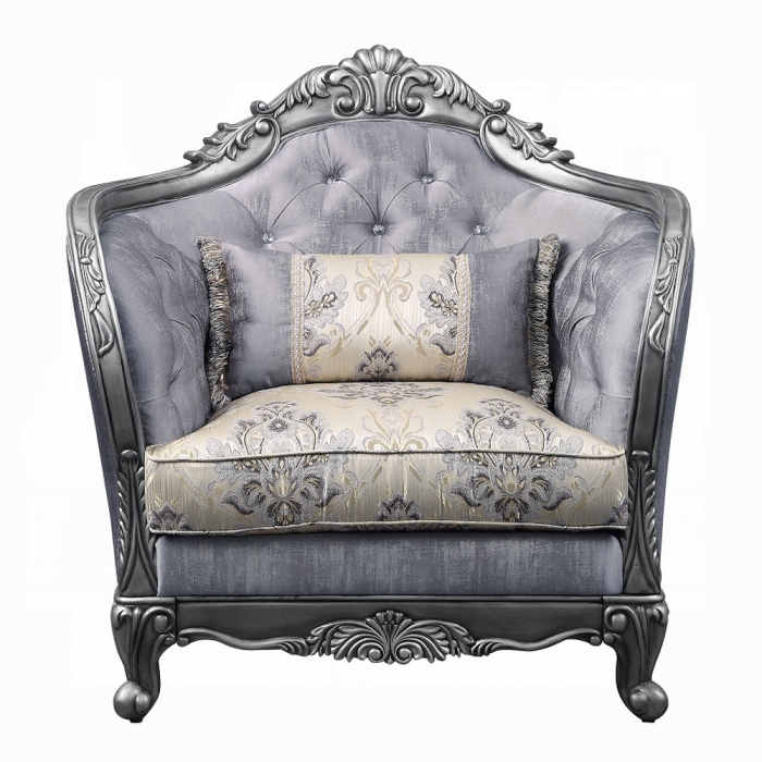 | The Ariadne sofa collection is fit for royalty! The platinum finish of the wooden frame complements the lustrous upholstery over button-tufted seatback and inner armrests. Carved flourishes crown the arched seatbacks and extend down the molding around the high shelter armrests. Included with this set are accent pillows with floral patterns. Matching occasional tables complete this collection for a regal ambience. *Please note that the base price only includes (1) Sofa. Please add the additional items to customize this set to your liking.
