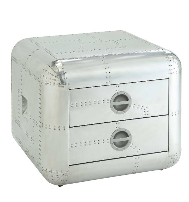 | The Brancaster coffee table is the perfect statement piece and goes well with leather upholstery. This rectangular trunk designed aluminum coffee table is designed with a mid-20th century aircraft in mind and features rounded corners, one Felt-Lined drawer with self-closing function and inset drawer pulls giving it sleek aerodynamic lines. This unique table makes heads turn with its riveted aircraft aluminum construction. *Please note that the base price only includes (1) Coffee Table, please add the end table to customize this set to your liking.