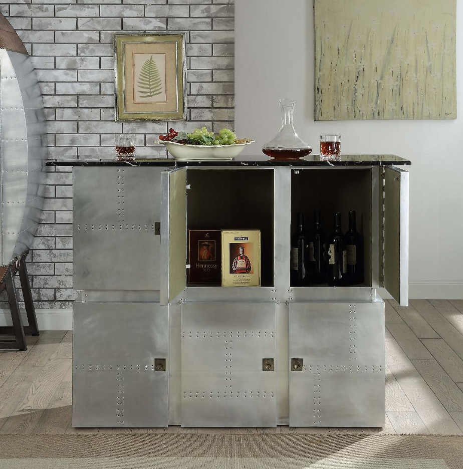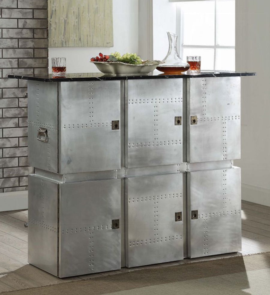 | The Brancaster bar table is a handsome statement piece combining the warmth of natural materials with industrial appeal of a marble top. This black marble top bar table is finished with an aluminum frame for exceptional color depth, and features six patchwork aluminum doors. Thoughtfully crafted, this bar table offers a foot rail that encourages guests to linger and relax enjoying your company.