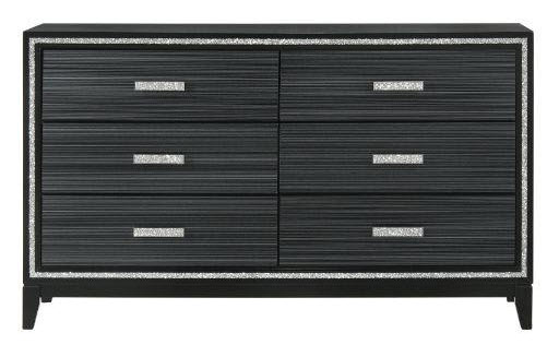 | Classic design with touches of modern aspects makes this Haiden Dresser ideal for any bedroom. The piece offers a rectangular tabletop and six storage drawers for displaying or organizing. It also features a glamorous shimmering silver accent trim that adds richness to design. The drawer handles with the same shimmering silver tie them all together to create a cohesive look. The black finish makes it easy to fit into already existing decor. *Please note that the base price only includes (1) Dresser. Please add the additional mirror to customize this set to your liking.
