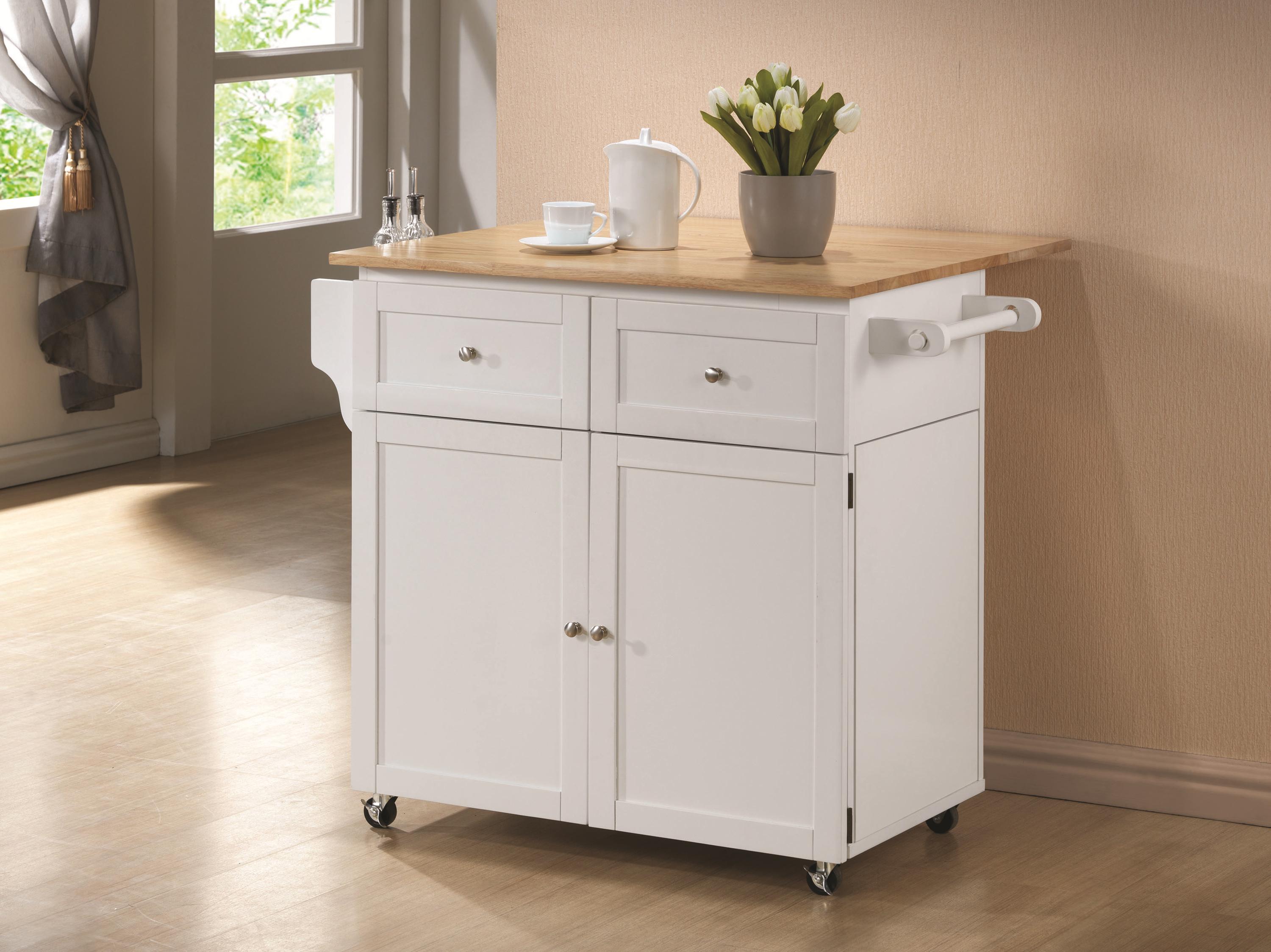 | Make your kitchen as functional and fashionable as possible. With a bright modern farmhouse motif, this kitchen cart organizes tasks and storage options into one central unit. Solid rubberwood offers a stylish composition that shows off a butcher block work surface. Fresh white and natural brown finish deliver decor versatility. Keep tasks simple with a towel rack, spice rack, a hidden cabinet for trash, and casters for portability.