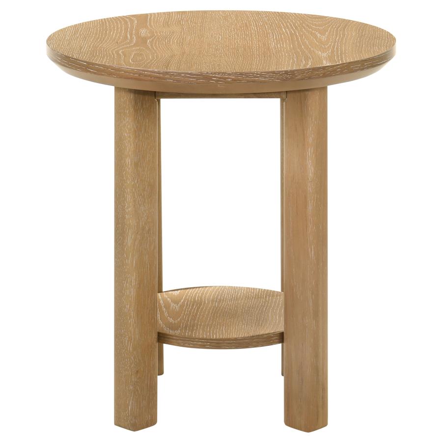 | Softened by curves and framed in quiet strength, this round coffee table invites connection and ease. Its generous circular top rests upon thick, sculptural legs, while a low shelf below adds space for books, baskets, or treasured accents. Made from solid wood, engineered wood, and white oak veneer, this table is a study in balance—grounded yet graceful, bold yet inviting. Designed to anchor the room with warmth and intention, it is as functional as it is timeless. *Please note that the base price only includes (1) Coffee Table, please add the additional End Table to customize this set to your liking.