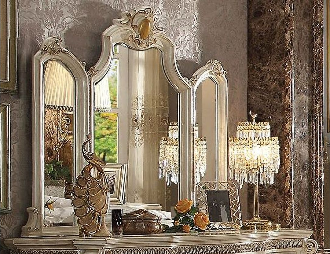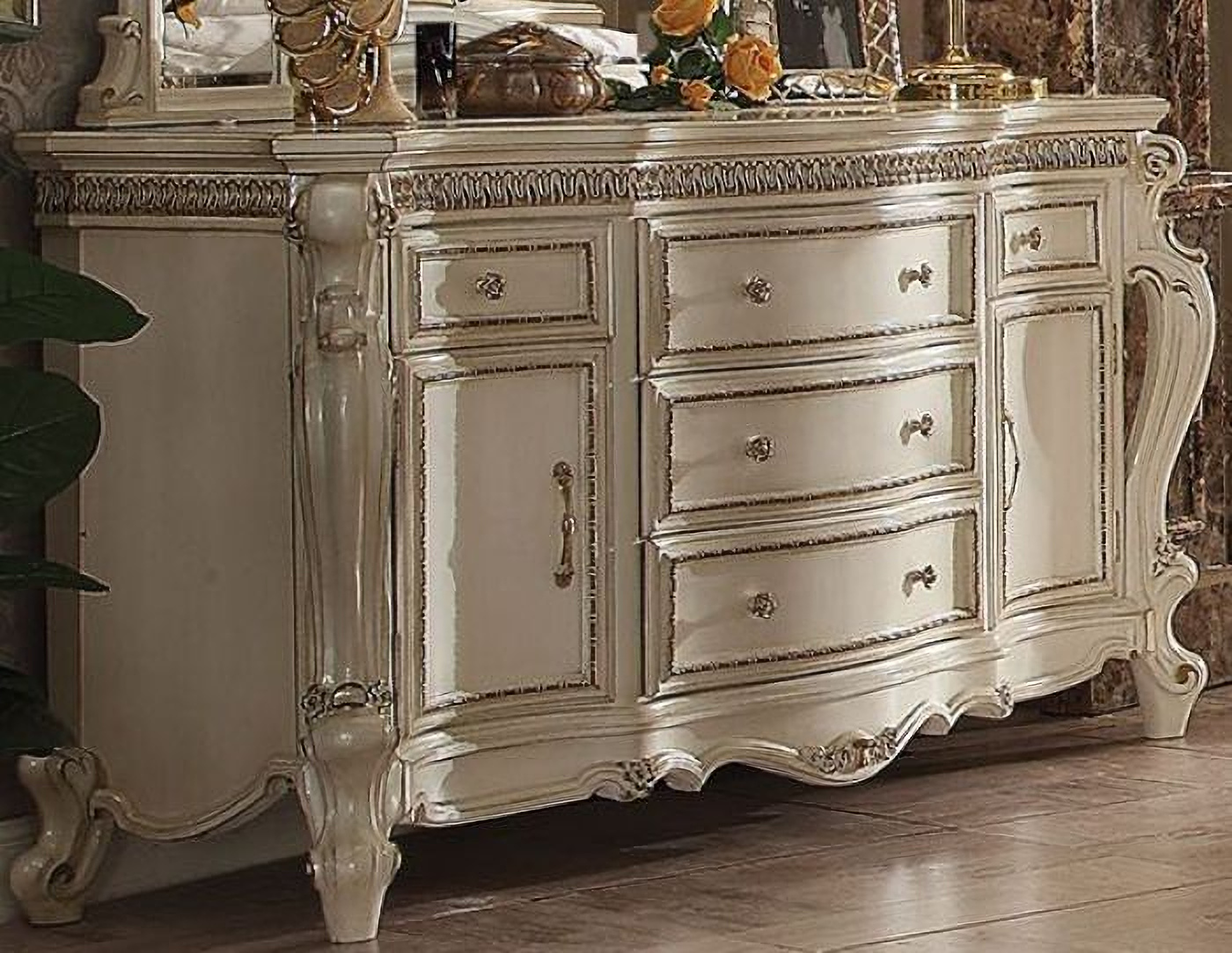 | Opulent and grand, the Picardy dresser in butterscotch PU and antique pearl finish is an ideal storage option for any bedroom. It offers plenty of drawer storage space for all your clothing and accessories. It brings the influence of European antiques to life with traditional carvings, detailed looping, and a gorgeous antique pearl finish. The hand-applied finish enhances the beauty of the detailed woodwork and carvings. *Please note that the base price only includes (1) Dresser. Please add the additional mirror to customize this set to your liking.