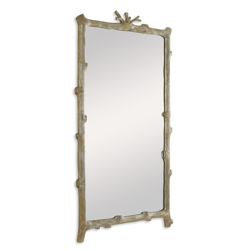 Inspired by organic forms in nature, this elegant mirror features a sculptural frame crafted from cast aluminum tree branches, creating a striking and artistic silhouette. Finished in a soft gold leaf, the branching design adds warmth and texture while beautifully framing the clear glass mirror for a refined, nature-inspired statement. Ideal for entryways, living spaces, or bedrooms, this piece blends artistry with functionality and includes a metal cleat for easy and secure installation. Measuring 30"W x 4"D x 56"H, the mirror offers generous vertical presence while maintaining a lightweight yet durable construction. Product Details