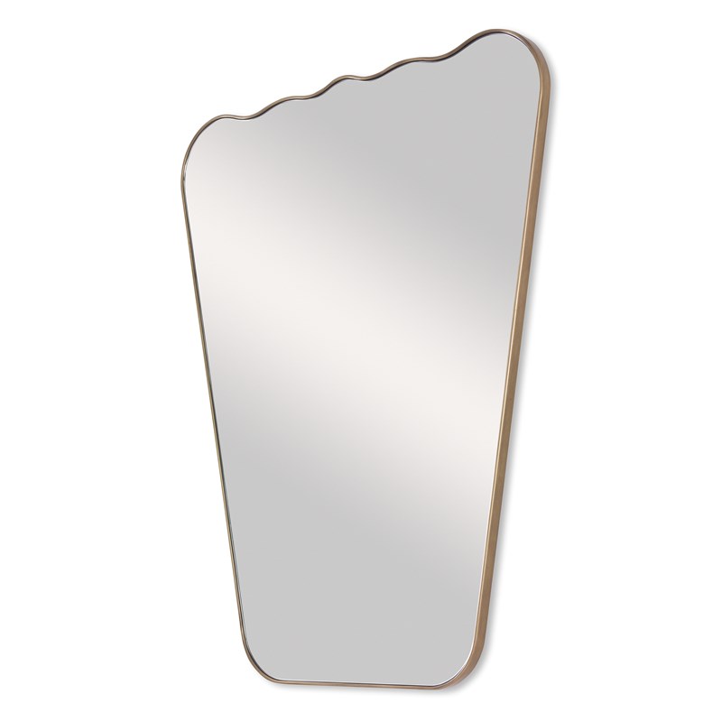 This distinctive tapered mirror features a graceful wavy top that adds a subtle artistic touch to its refined silhouette. Framed in a slim metal border finished in antiqued brass, the design offers a warm, vintage-inspired accent that complements both classic and contemporary interiors. The clear glass mirror provides crisp reflection while the elegant frame enhances its decorative appeal. Designed for easy wall mounting, it includes a cleat for secure installation. Measuring 38" W x 2" D x 48" H, this statement mirror blends functionality with sophisticated style, making it an ideal addition to entryways, living spaces, or bedrooms. Product Details