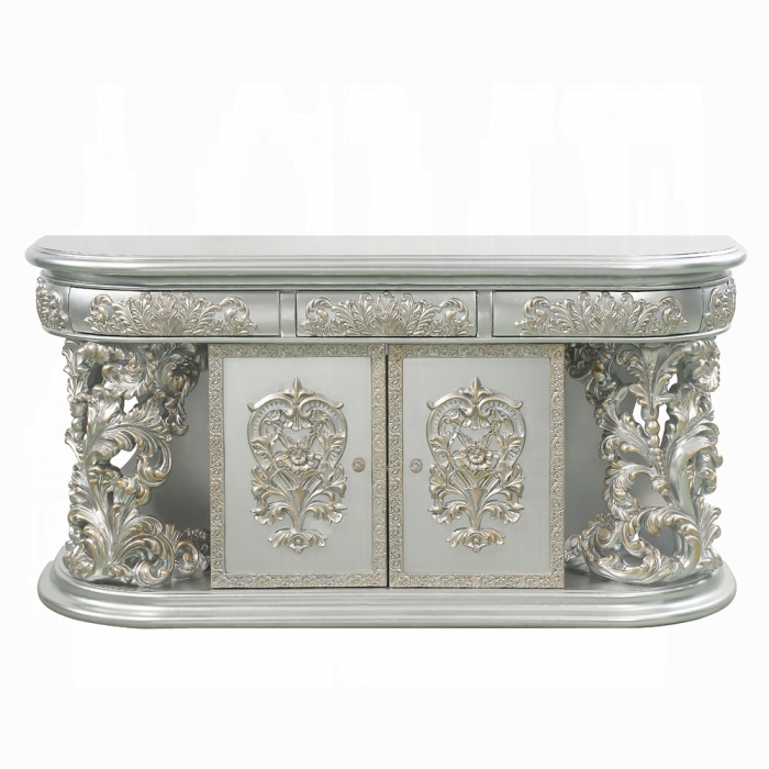 | A luxurious antique silver finish with hand-brushed gold accents makes up the Sandoval dresser. Surrounded by fine Rococo scrolls and floral ornament crowns with stylized ribbons. Featuring three convenient storage drawers and two-door storage compartments. The base has an intricate open design for a modern appeal. The spacious table top has enough room for displaying jewelry and perfumes. *Please note that the base price only includes (1) Dresser. Please add the additional mirror to customize this set to your liking.