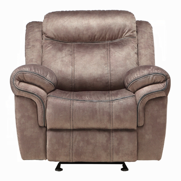 | The sleek and stunning Zubaida reclining sofa group fuses charm and design to create the ultimate in relaxation. This motion glider recliner will perfectly accommodate any contemporary living room setting by providing plush and stable support and spacious storage function. Fine upholstering and a reinvented modern style, enhance your living room area with this unique set. Available in both two tone chocolate velvet and two tone gray velvet finishes to match your needs.